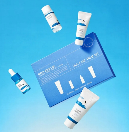 Kompletny zestaw pielęgnacyjny Round Lab Birch Juice Skin Care Trial Kit zawiera cztery produkty do codziennej pielęgnacji skóry twarzy: żel do mycia, tonik, serum oraz krem – każdy z nich bazuje na soku z brzozy, znanym z intensywnie nawilżających, łagodzących i przeciwzapalnych właściwości. Miniaturowe opakowania to idealne rozwiązanie zarówno do przetestowania serii, jak i na wyjazdy.