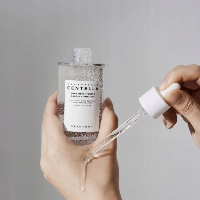 Ampułka Skin1004 Madagascar Centella Tone Brightening Capsule to zaawansowane serum do twarzy o lekkiej, żelowej formule. Zawiera aż 77% ekstraktu z wąkroty azjatyckiej, który koi, regeneruje i wzmacnia skórę wrażliwą i podrażnioną. Dzięki zawartości niacynamidu, kwasu traneksamowego i nowoczesnej formy witaminy C (3-O-Ethyl Ascorbic Acid), ampułka skutecznie rozjaśnia przebarwienia, wyrównuje koloryt i nadaje skórze promienny wygląd.