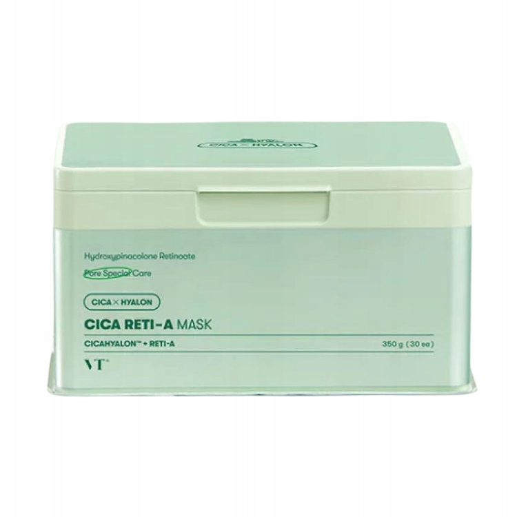 Zestaw masek VT Cosmetics CICA Reti-A Mask to innowacyjne rozwiązanie dla osób poszukujących skutecznego wsparcia w walce z oznakami starzenia i potrzebujących intensywnej regeneracji skóry. Produkt bazuje na połączeniu retinolu, bakuchiolu, ekstraktu z wąkroty azjatyckiej i peptydów, które wspólnie dbają o odnowę, ukojenie i nawilżenie skóry.